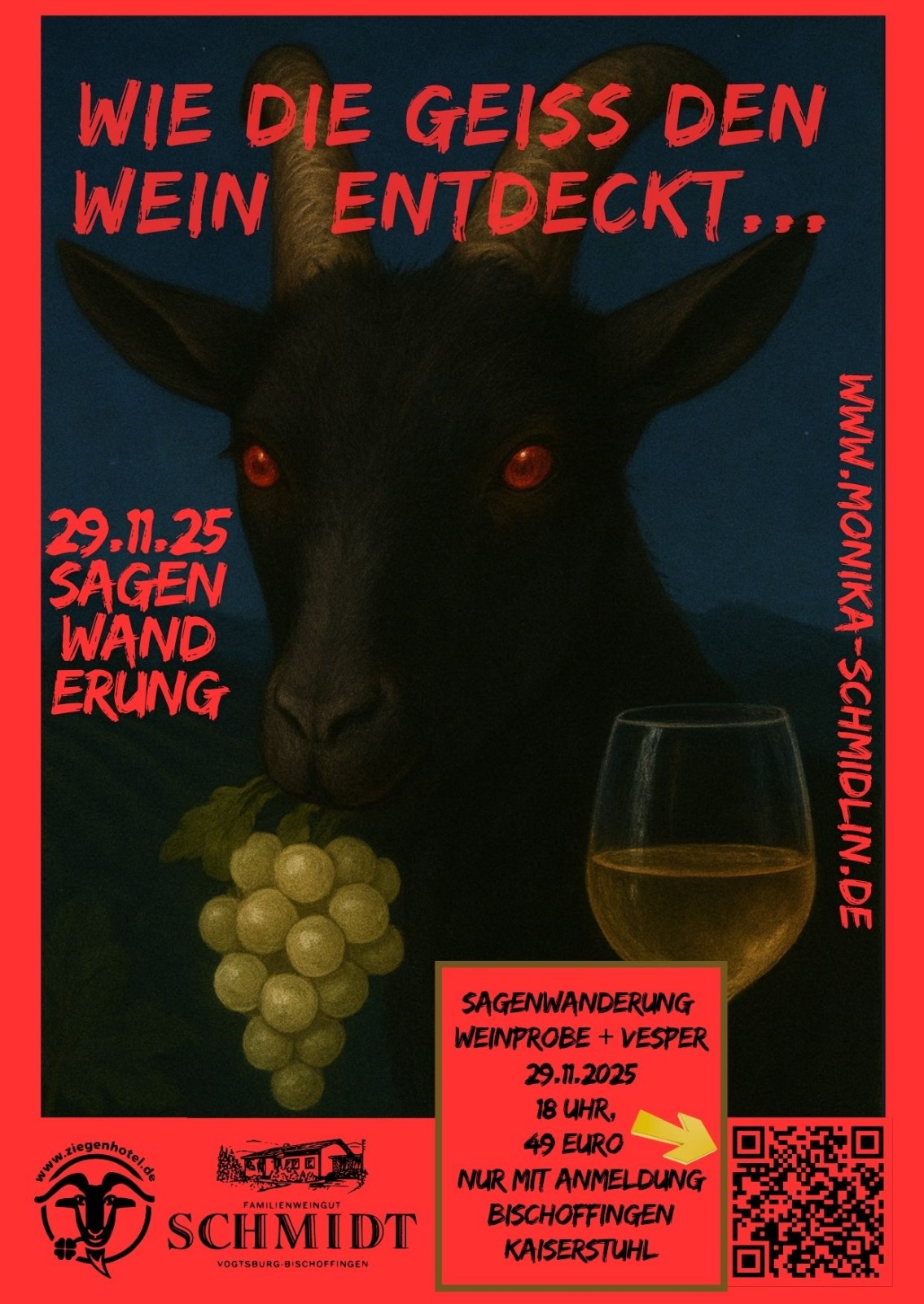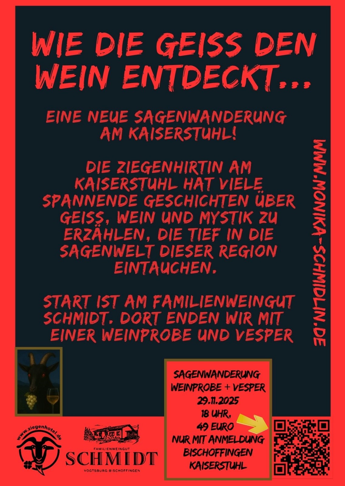 Wanderungen und Touren mit der Frau vom Rebbür am Kaiserstuhl und Ihren Ziegen. Auf Facebook und Instagram findet Ihr die aktuellsten Informationen.